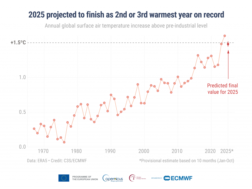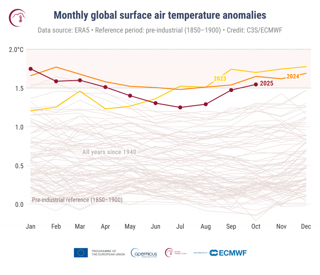 „Uprkos tome što 2025. možda neće biti najtoplija godina, gotovo je sigurno da će se naći među prve tri”, istakla je Samanta Berges iz Evropskog centra za srednjoročnu prognozu vremena pri Kopernikusu. „Poslednje tri godine zabeležene su izuzetne temperature, a prosek od 2023. do 2025. verovatno će premašiti 1,5 °C, prvi put u periodu od tri godine.”